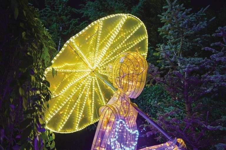走进灯会现场,仿佛置身于一个梦幻般的世界,各式各样的花灯错落有致地分布在公园各个角落,令人目不暇接。宗角禄康公园的走廊里、草坪上,一盏盏精美的灯组在夜色的映衬下显得更加璀璨夺目,展示出江南烟雨、小桥流水、青砖黛瓦、梅瓶明珠、桃花仙鹤、油伞折扇、上元灯彩等富有江苏特色的美景雅韵,让人似乎来到江南水乡,亲身感受那一份宁静与美好。当然,此次灯会最引人瞩目的便是“苏拉一家亲”大型灯组,运用拉萨经典配色搭建飘逸的彩带双翼,再搭配拉萨的吉祥物牦牛和江苏的吉祥物麋鹿,充分表达了“苏拉一家亲,携手向未来”的寓意。