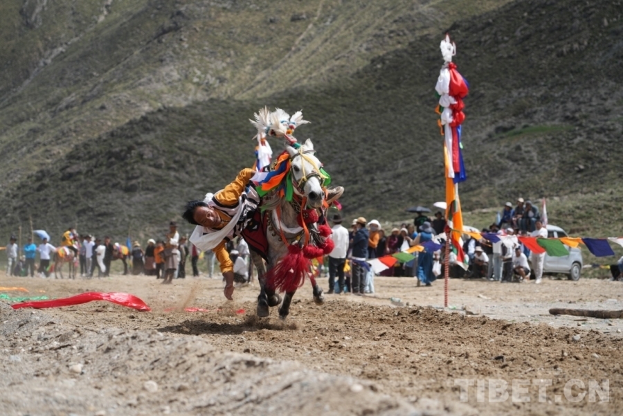 图为拉萨市曲水县曲水镇曲甫村举办的“热烈庆祝西藏自治区成立60周年暨赛马节活动”现场,此活动也是望果节活动的一部分 摄影:王茜