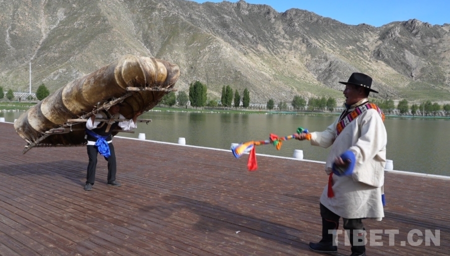 图为廓孜国家级非遗代表性传承人拉巴次仁(右)和师弟罗布(左)跳廓孜舞(牛皮船舞) 摄影:王茜