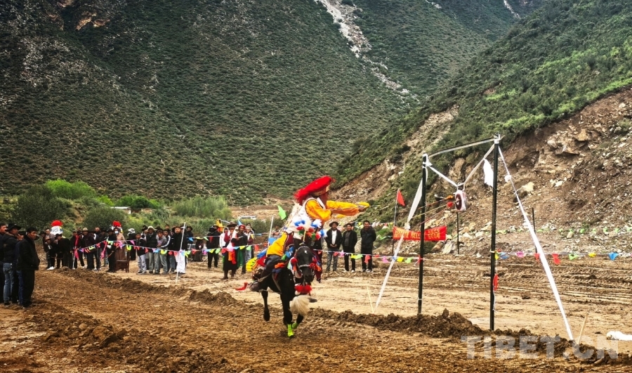 图为西藏自治区山南市贡嘎县昌果乡普夏村望果节赛马会现场,骑手正在参加骑马射箭比赛 摄影:刘莉