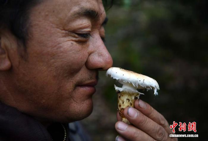8月28日,扎称在甘孜州乡城县色坝村细嗅松茸。中新社记者 王磊 摄