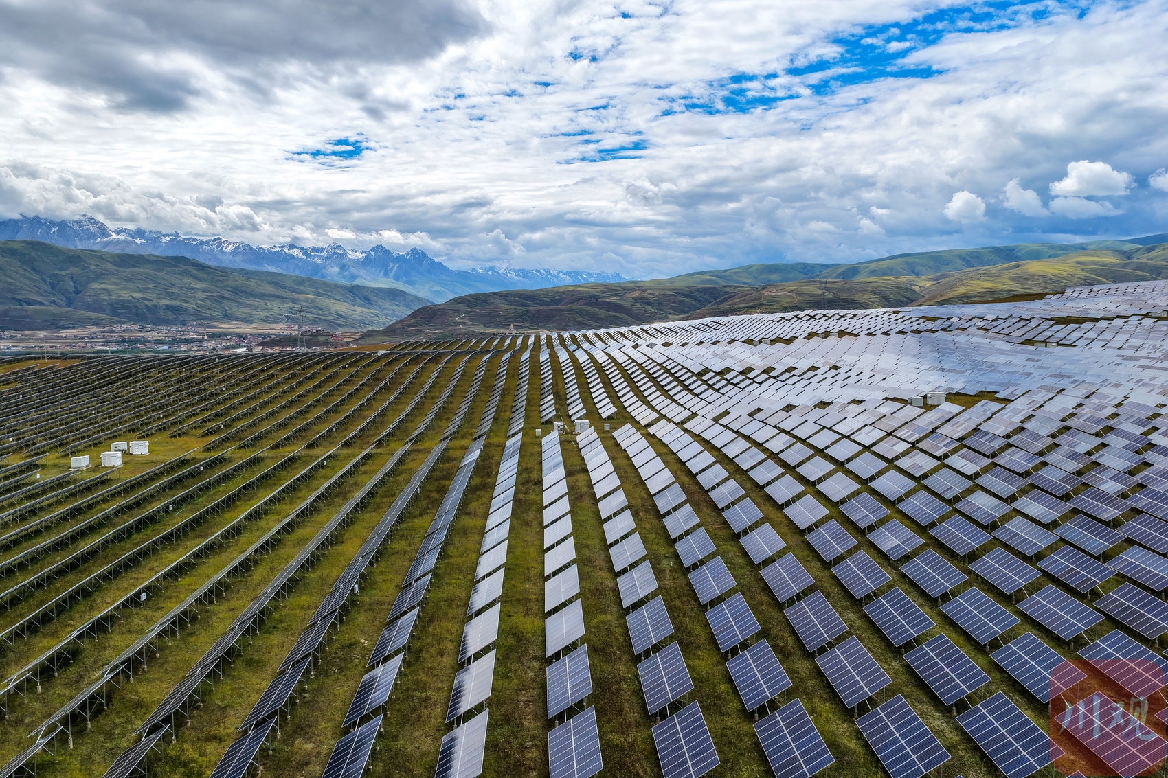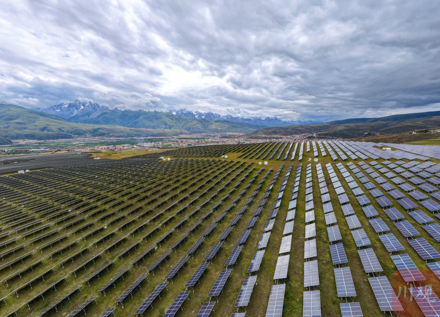 2025年8月30日, 在四川省甘孜州甘孜县甘孜镇火古龙村草原上,甘孜县火古龙光伏电站16万块光伏板在海拔3500米的高原上逐光而列,远远望去像极了蓝色海洋。李向雨 摄