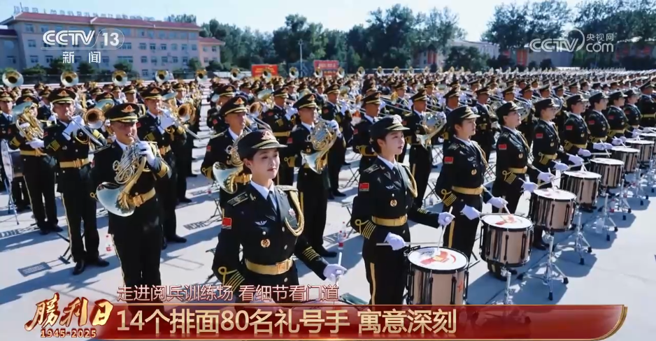 本次联合军乐团在演奏队形的编排上,整体设置了14个排面,寓意14年抗战;前排设置了80名礼号手,寓意抗战胜利80周年。