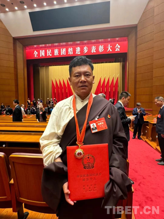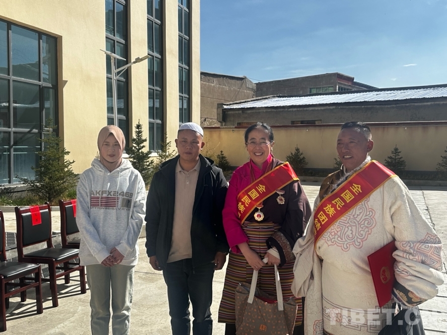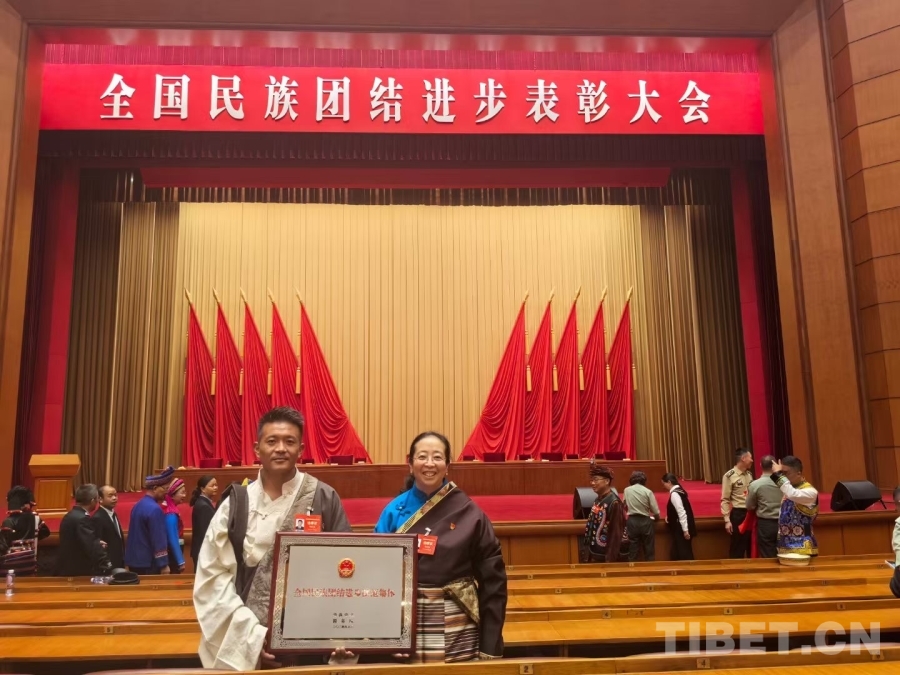 图为全国民族团结进步模范集体代表顿珠才嘎与全国民族团结进步模范个人获得者次仁拉姆