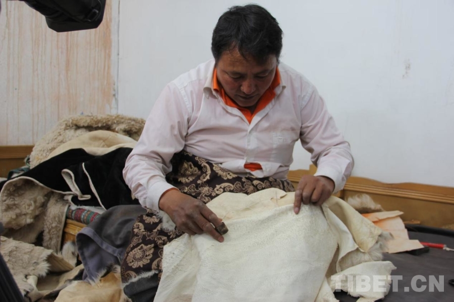 图为申扎县牧民缝制皮袍 申扎县文旅局供图