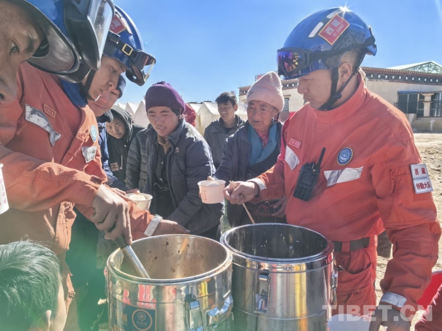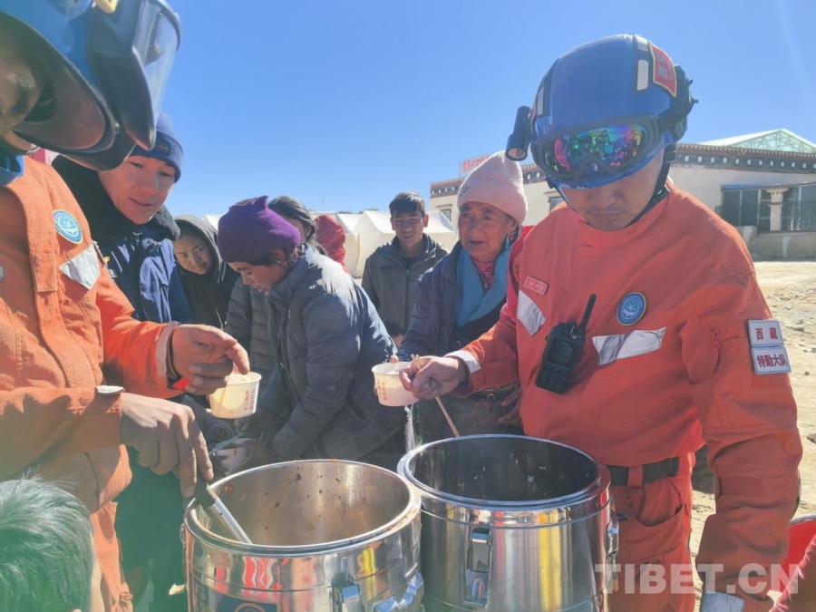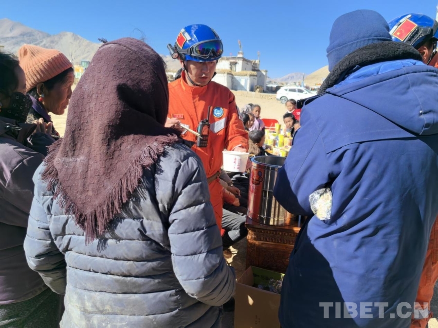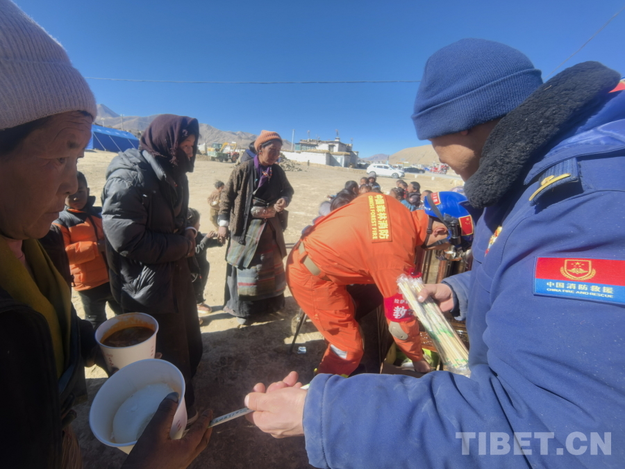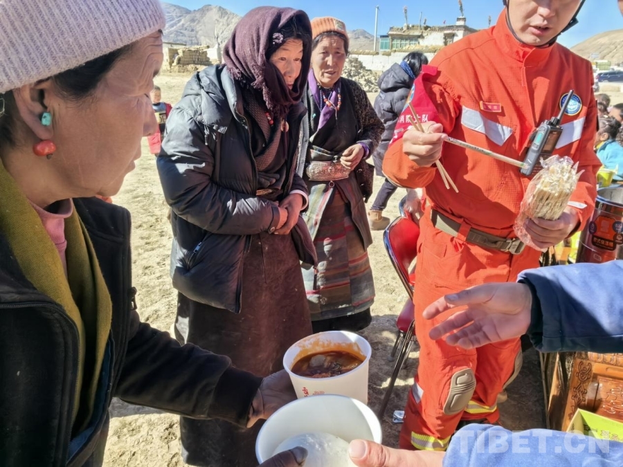 图为拉萨森林消防大队救援人员正在为西藏自治区日喀则市定日县曲洛乡措昂村受灾群众分发热乎乎的炖菜和馒头 拉萨森林消防大队供图