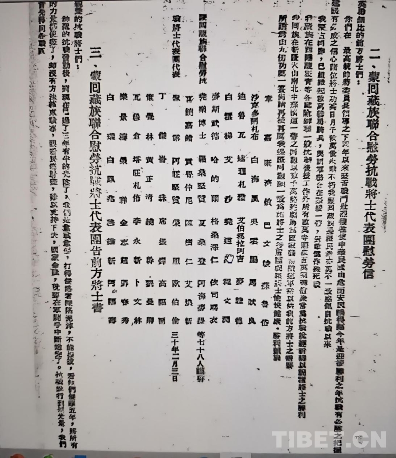 图为《蒙回藏族联合慰劳抗战将士代表团告前方将士书》(喜饶尼玛供图)