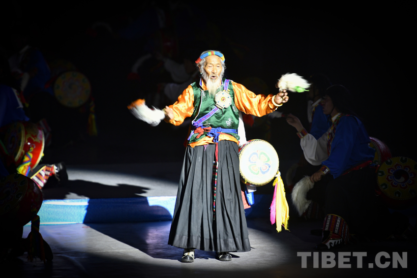 图为山南卓舞《吉祥卓舞》,81岁的卓舞国家级代表性传承人尼玛老人登台表演 摄影:赵振宇