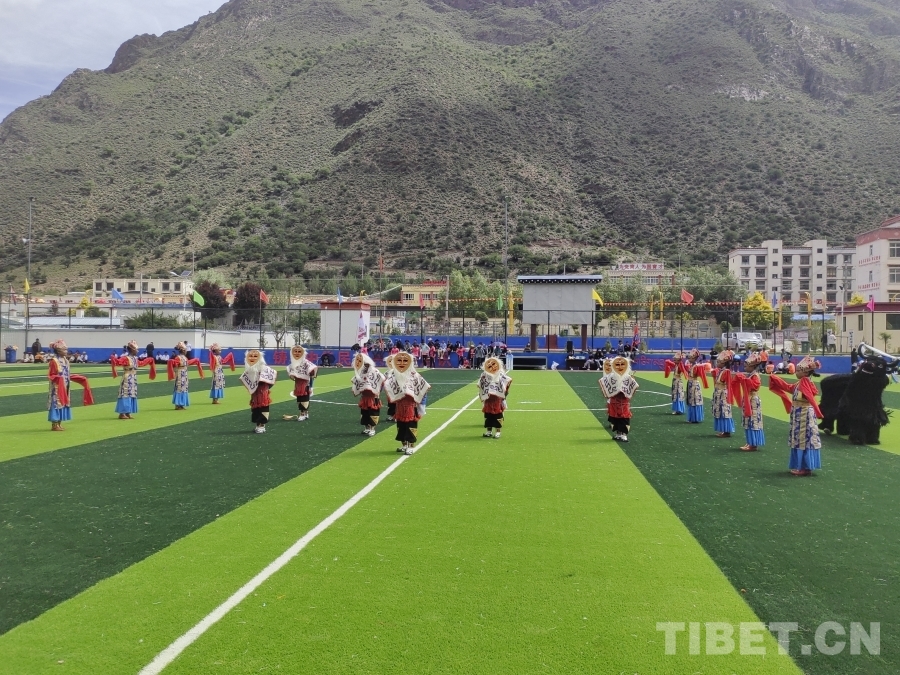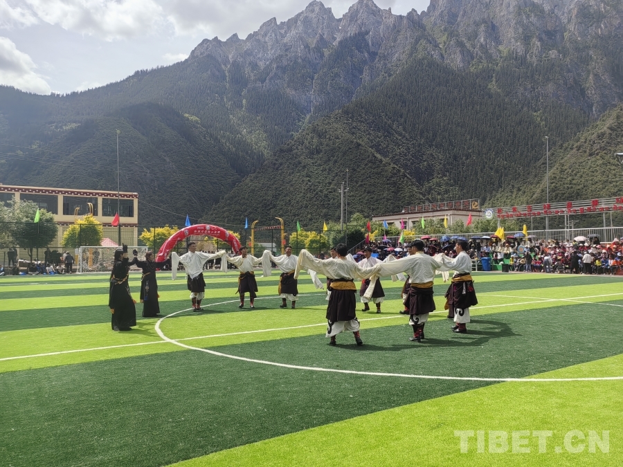 图为西藏洛隆县达龙乡第二届中远海运乡村足球联赛“吉祥杯”开幕式上的舞蹈表演