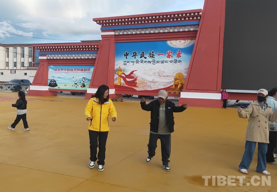 图为在尼玛县民族团结进步主题广场,笔者向扎西索朗学跳锅庄舞 摄影:昂翁洛布
