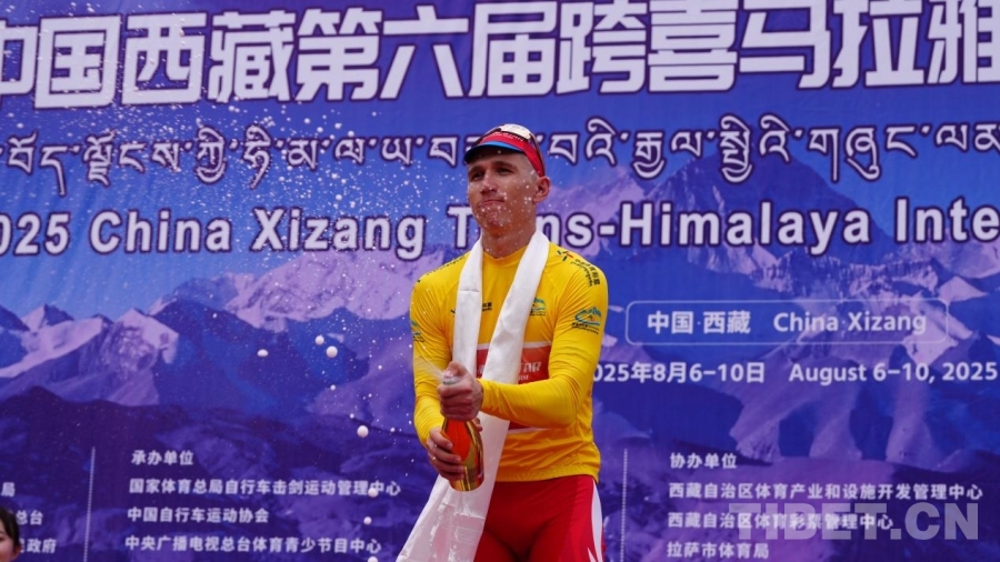 图为2025中国西藏第六届跨喜马拉雅国际公路自行车极限赛林芝首赛段第一名tsishkou raman在庆祝胜利 摄影:次旦拉姆