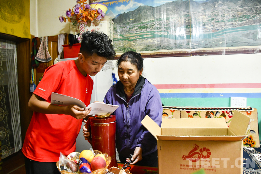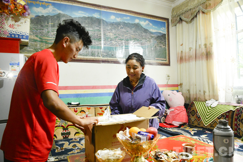 图为卓嘎与儿子罗布次仁一起郑重打开中央代表团赠送的全自动酥油茶壶包装 摄影:赵振宇