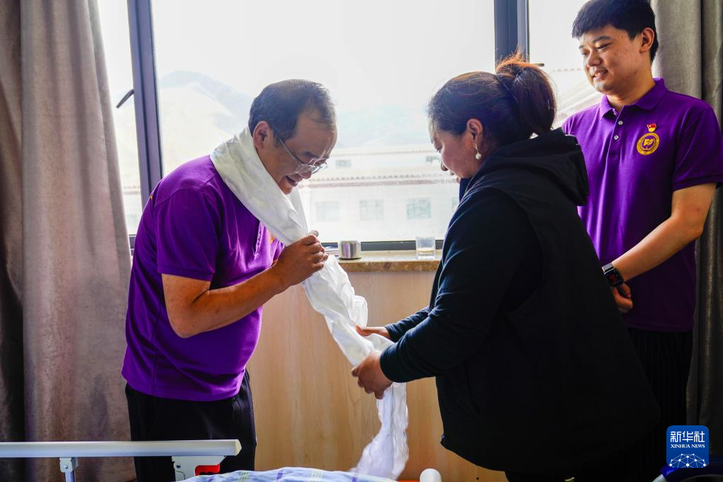 患者母亲尼珍向医护人员敬献哈达以表感谢。 新华社记者 刘洪明 摄