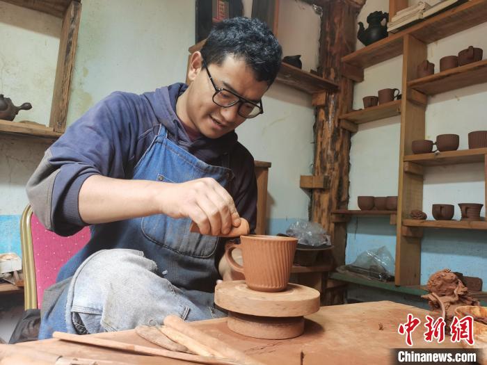 图为拉茸肖巴在精心打磨杯子胚体。黄兴鸿 摄