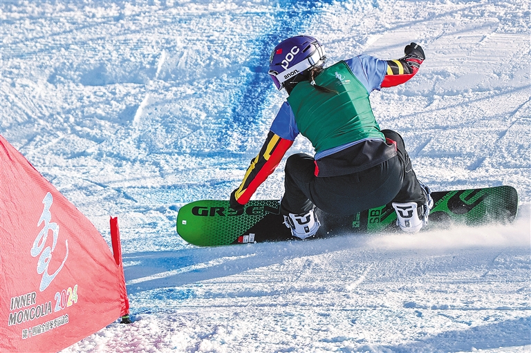 图为2月19日,在内蒙古乌兰察布市凉城滑雪场举行的第十四届全国冬季运动会单板滑雪青年组女子障碍追逐赛中,中国西藏队选手拥青拉姆正在比赛(资料图片)。新华社记者 伍志尊 摄