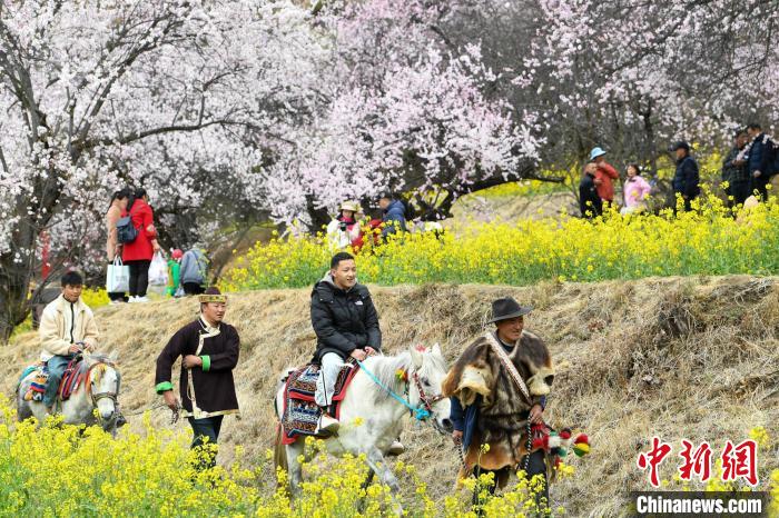 图为2024年3月31日林芝桃花节期间,嘎拉村村民带领游客骑马赏花。贡嘎来松 摄