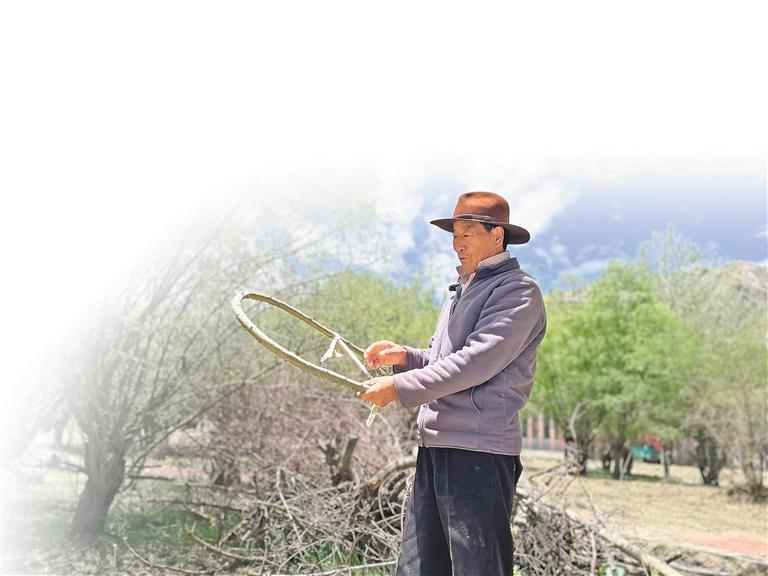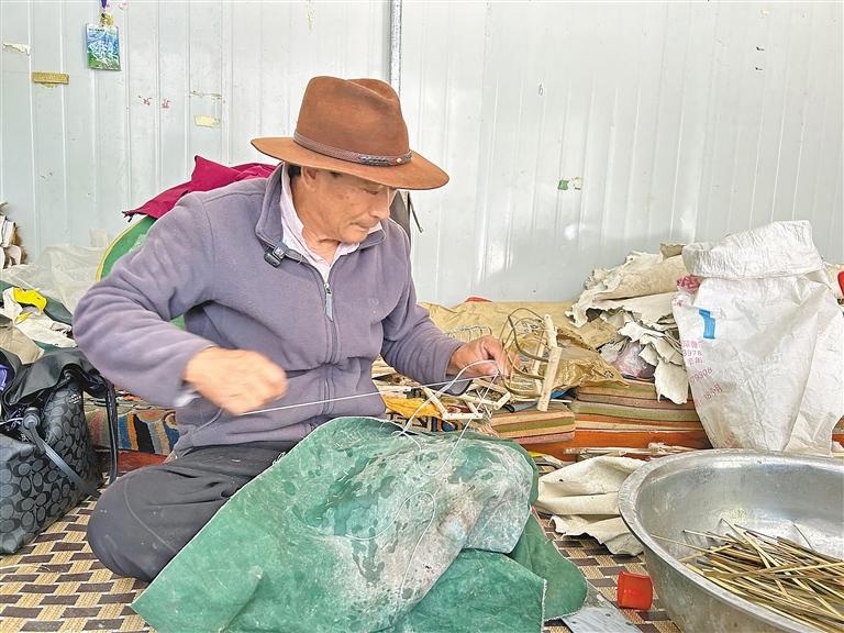 次仁正在制作工艺牛皮船。记者 晓勇 摄