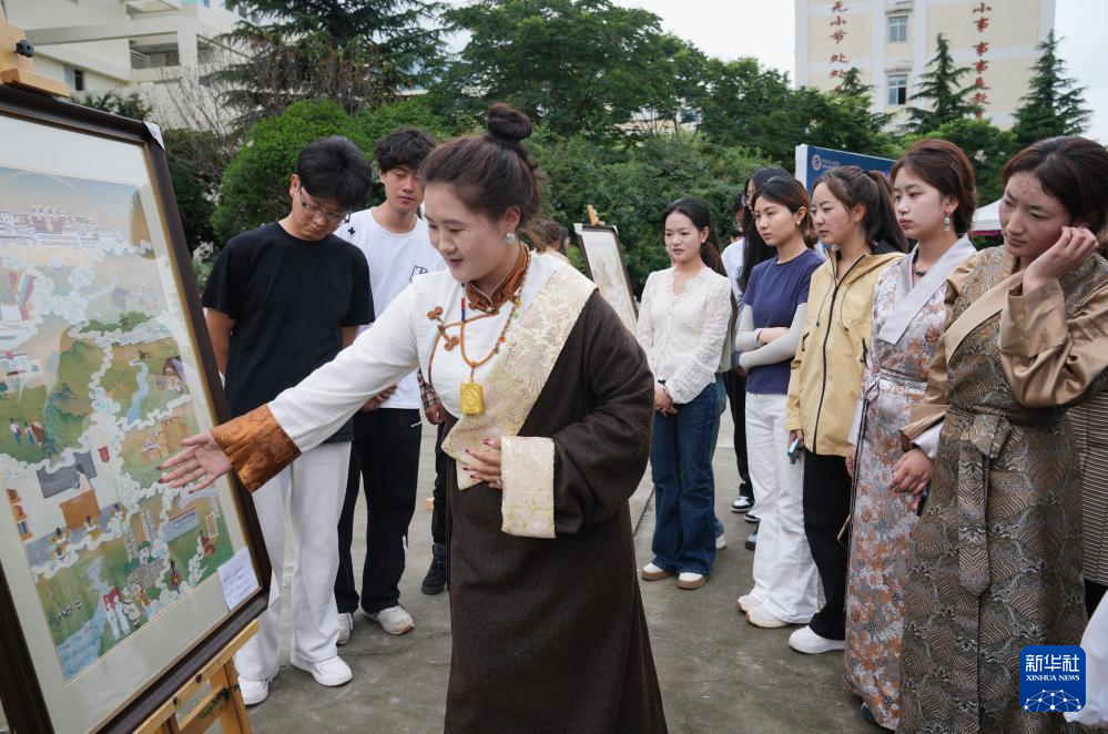 6月19日,阿坝职业学院民族传统技艺(唐卡)专业学生尕藏切忠(左三)向观看毕业作品展的同学介绍她的作品《追梦赤子心》的创作思路。新华社记者 江宏景 摄