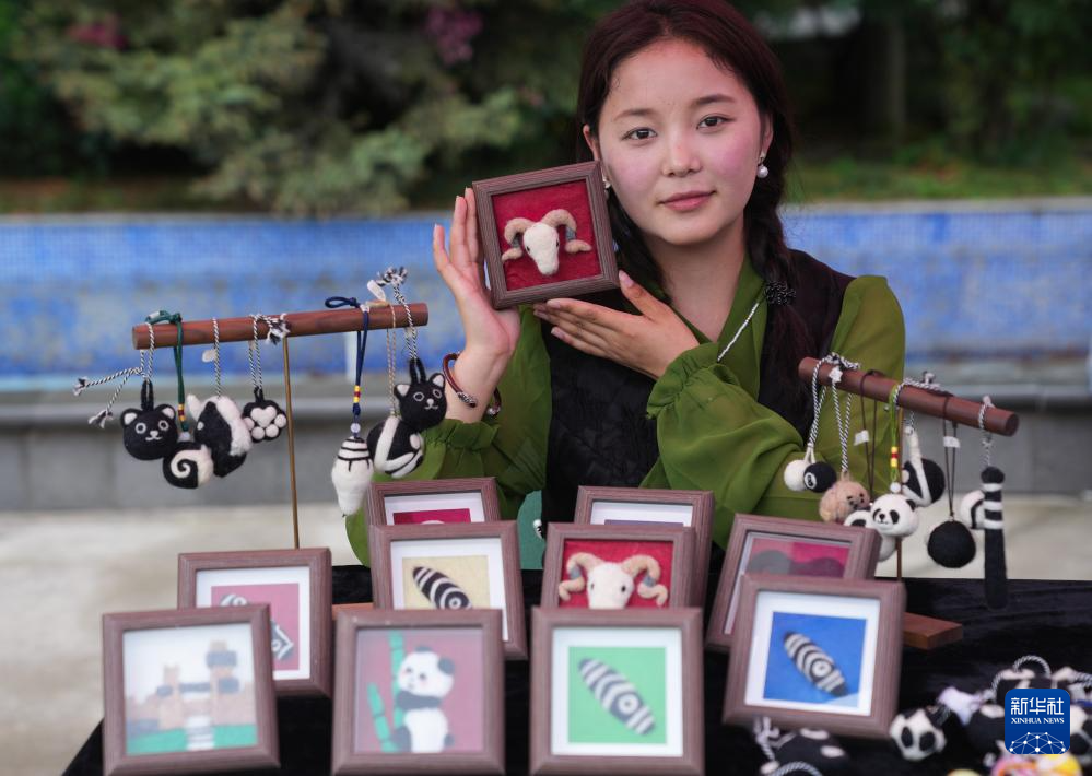 6月19日,阿坝职业学院民族传统技艺(唐卡)专业学生扎西卓玛展示她创作的文创作品。新华社记者 江宏景 摄