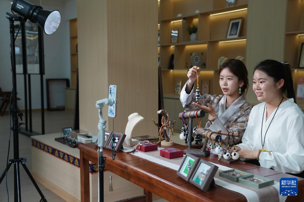 6月19日,阿坝职业学院民族传统技艺(唐卡)专业学生仁增卓玛(左)、郭超在新媒体平台上销售她们的文创作品。新华社记者 江宏景 摄