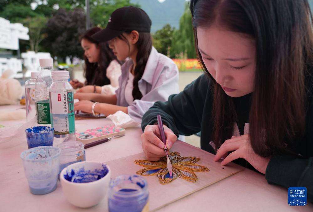 6月19日,阿坝职业学院的学生在民族传统技艺(唐卡)专业毕业作品展上体验景泰蓝制作技艺。新华社记者 江宏景 摄