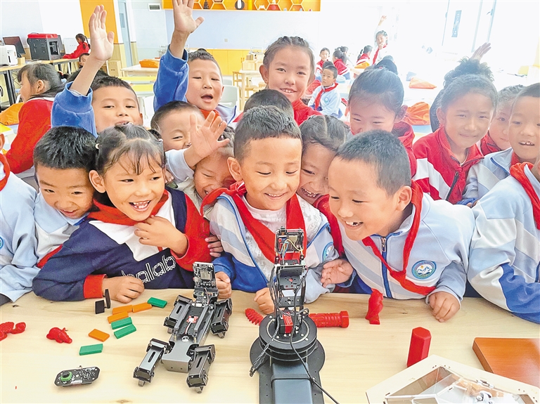 在桑珠孜区青岛小学的科学课堂上,智能实验台前围满了兴致勃勃的孩子,他们手持 3d 打印笔,精心绘制着心中的“太空基地”。作为西藏首个启动“ stem ”科学课程的地区,这里不仅建成了全区首个小学科创实验室,还被教育部认定为西藏唯一的全国“白名单”科创赛事基层组织单位。“以前,孩子们只能从课本上了解实验,现在能亲手操作机器人、设计航天模型。”青岛小学党支部书记周杰介绍道。科创课程的开展,如同一把钥匙,打开了孩子们创新思维和科学探索的大门,为高原青少年搭建起展示科学素养与创新能力的舞台,推动当地教育事业迈向新高度。