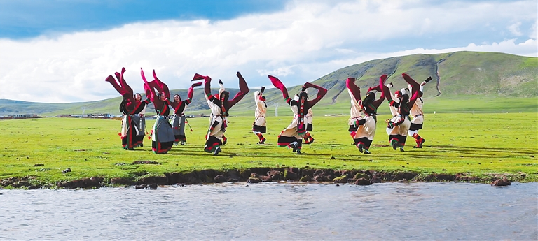 近年来,那曲文旅局以那曲传统锅庄舞展演为突破口,进一步推进那曲优秀传统文化创造性转化和创新性发展,全力打响那曲锅庄舞品牌。 图为那曲市群众艺术锅庄队队员在草原上跳锅庄舞。(那曲市文旅局非遗处提供)