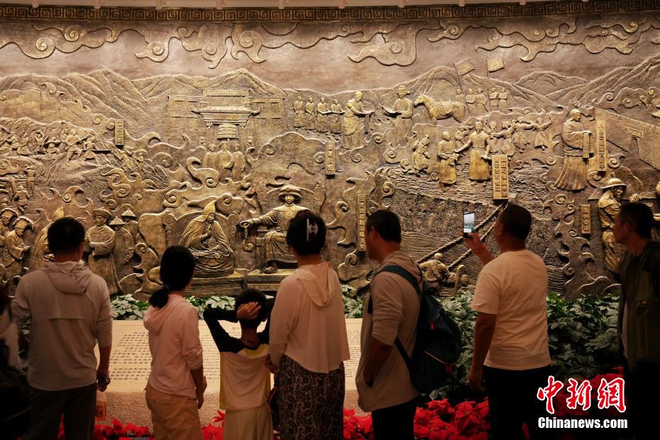 7月15日,在位于西藏拉萨的西藏博物馆,观众参观西藏历史画卷浮雕。据了解,西藏博物馆设有基本陈列《雪域长歌—西藏历史文化展》《离太阳最近的人—西藏民俗文化展》,充分展示西藏地区历史发展进程与文化面貌。中新社记者 张祥毅 摄