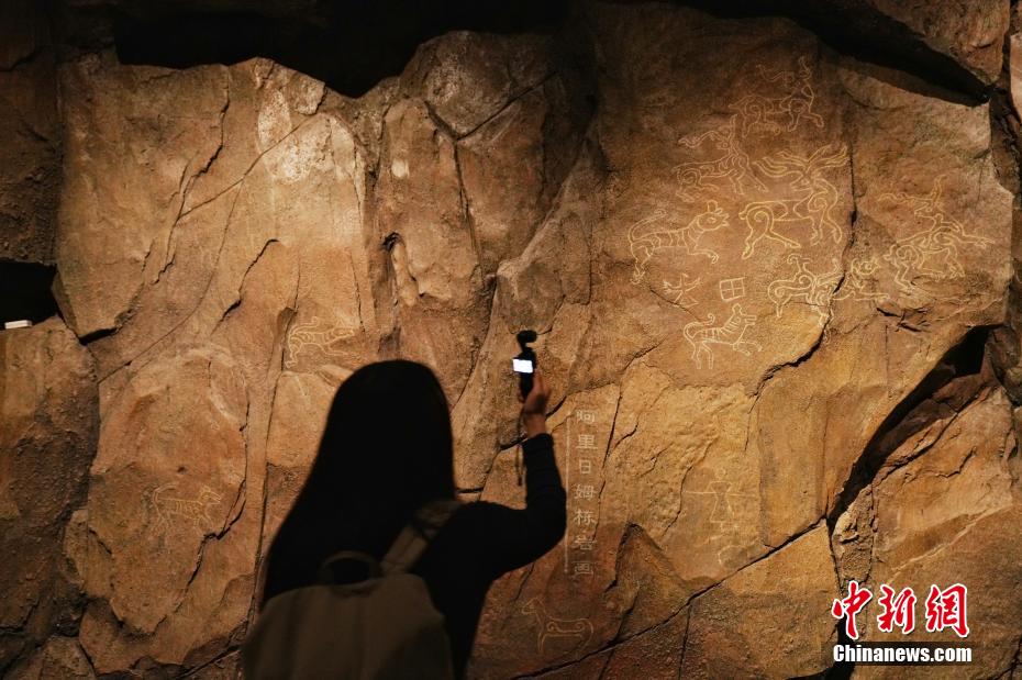 7月15日,在位于西藏拉萨的西藏博物馆,观众拍摄复原的阿里日姆栋岩画。据了解,西藏博物馆设有基本陈列《雪域长歌—西藏历史文化展》《离太阳最近的人—西藏民俗文化展》,充分展示西藏地区历史发展进程与文化面貌。中新社记者 张祥毅 摄