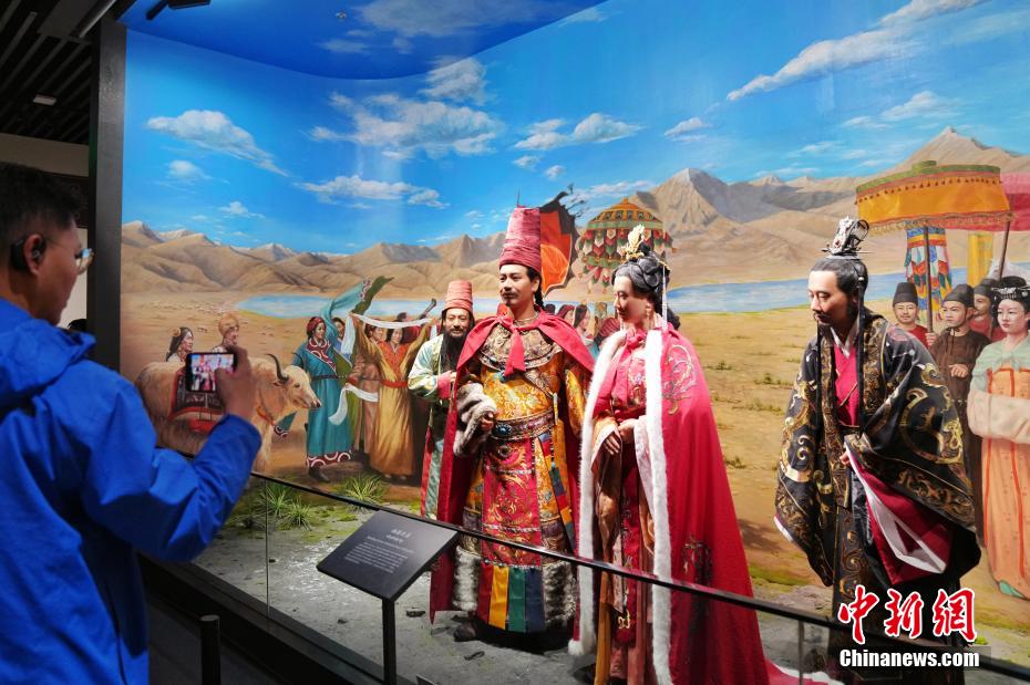 7月15日,在位于西藏拉萨的西藏博物馆,文成公主进藏的《柏海迎亲》塑像吸引观众。据了解,西藏博物馆设有基本陈列《雪域长歌—西藏历史文化展》《离太阳最近的人—西藏民俗文化展》,充分展示西藏地区历史发展进程与文化面貌。中新社记者 张祥毅 摄