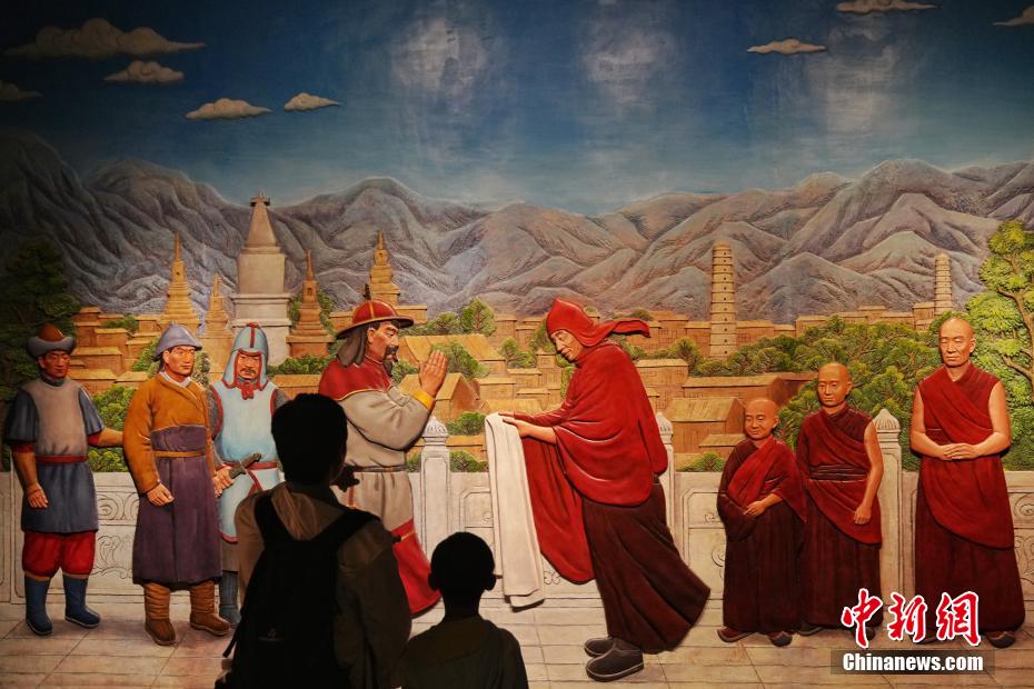 7月15日,在位于西藏拉萨的西藏博物馆,观众参观“凉州会谈”场景,“凉州会谈”结束了吐蕃地方政权对西藏的长期分治局面,顺应了国家统一的历史潮流。据了解,西藏博物馆设有基本陈列《雪域长歌—西藏历史文化展》《离太阳最近的人—西藏民俗文化展》,充分展示西藏地区历史发展进程与文化面貌。中新社记者 张祥毅 摄