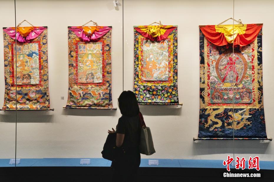 7月15日,在位于西藏拉萨的西藏博物馆,观众品鉴唐卡艺术。据了解,西藏博物馆设有基本陈列《雪域长歌—西藏历史文化展》《离太阳最近的人—西藏民俗文化展》,充分展示西藏地区历史发展进程与文化面貌。中新社记者 张祥毅 摄