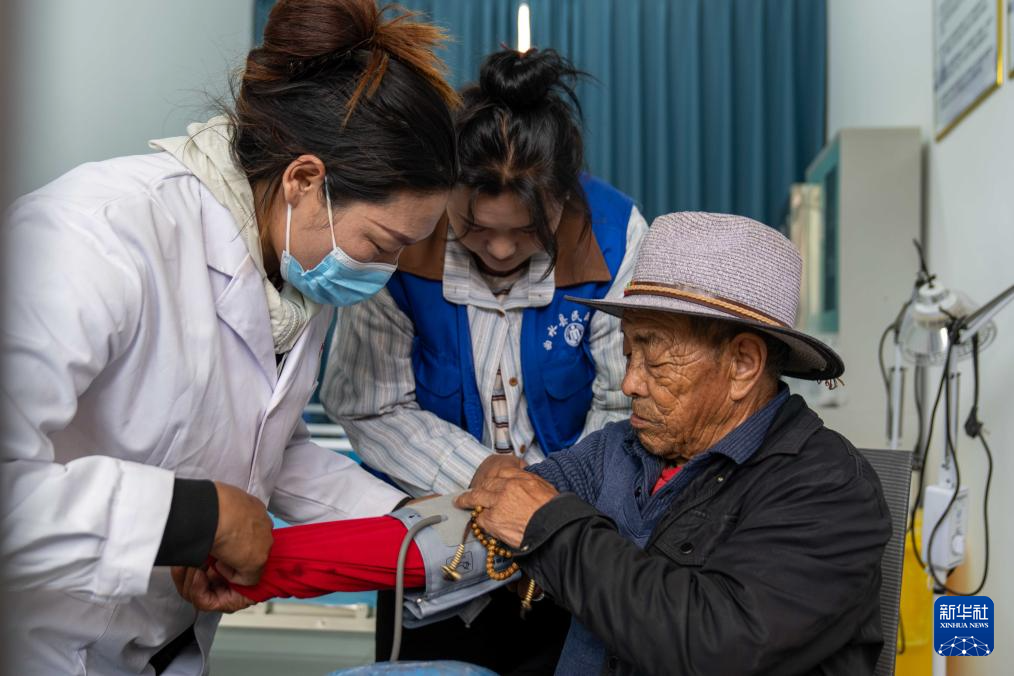 7月17日,村医德庆拉姆在三有村幸福驿站日间照料室里为老人测量血压。新华社记者 旦增尼玛曲珠 摄