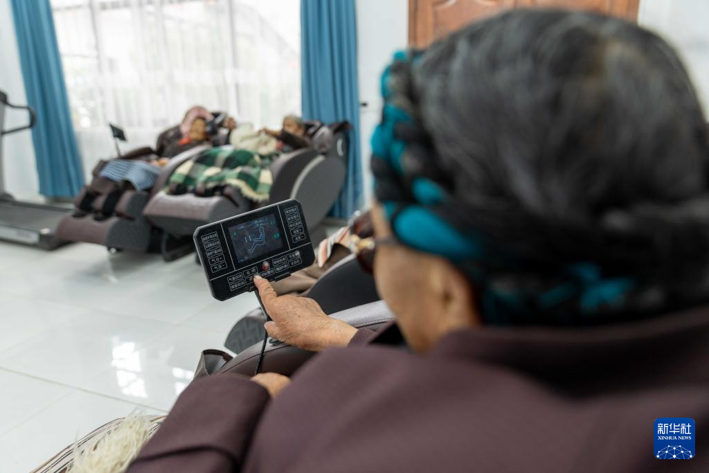 7月17日,老人们在三有村幸福驿站日间照料室的按摩椅上享受按摩。新华社记者 旦增尼玛曲珠 摄