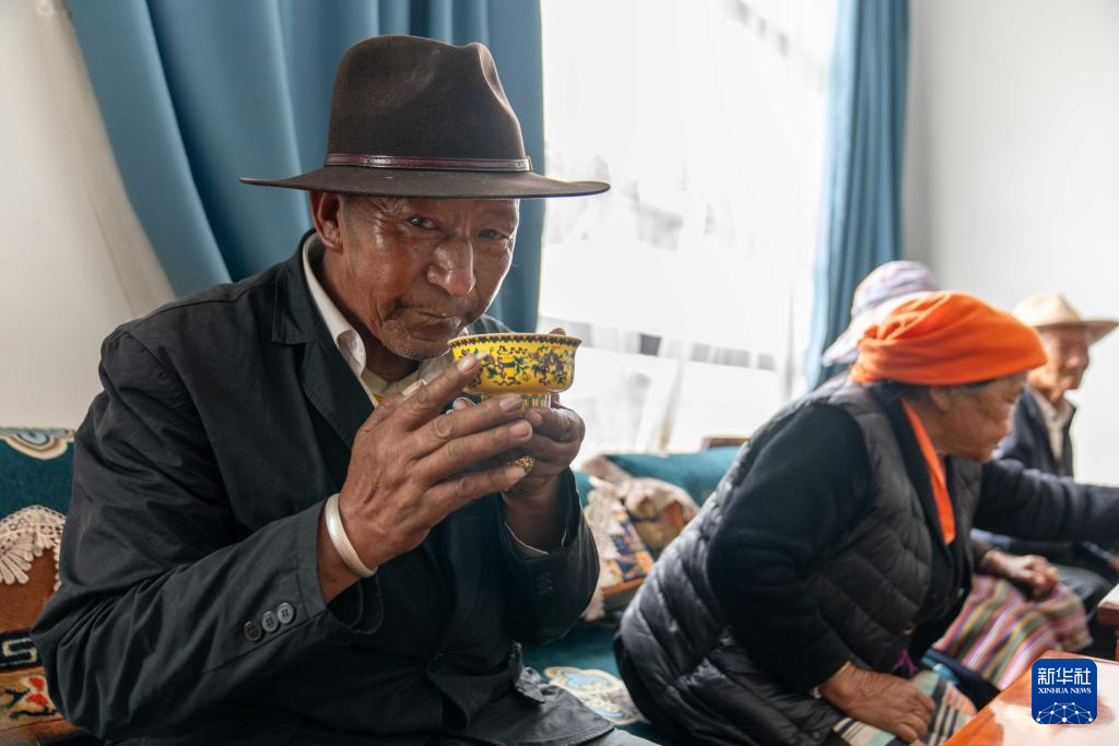 7月17日,洛桑群培老人在三有村幸福驿站日间照料室里喝茶。新华社记者 旦增尼玛曲珠 摄