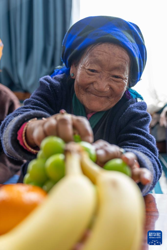 7月17日,拉珍老人在三有村幸福驿站日间照料室里吃水果。新华社记者 旦增尼玛曲珠 摄