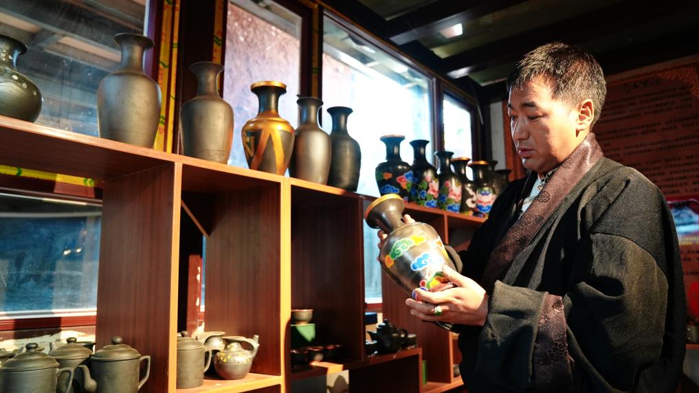 2025年7月5日,拉茸批初正在查看他制作的黑陶产品。(迪姬竹玛 摄)