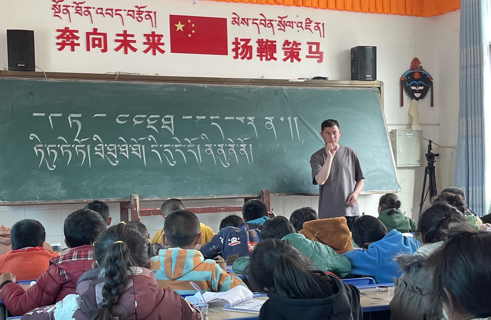 30岁的登真益尼来到来马镇小学已经7年了。7年前,他从四川职业技术学院(以下简称“川职院”)初等教育专业毕业,放弃了留在成都工作的机会,回到家乡甘孜县,主要从事藏文和藏文书法的教学工作。