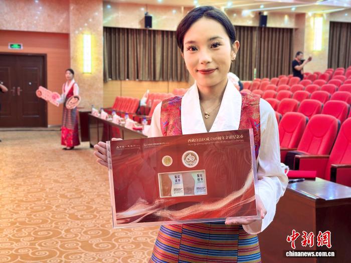 图为工作人员手持西藏自治区成立60周年金银纪念币。谢牧 摄