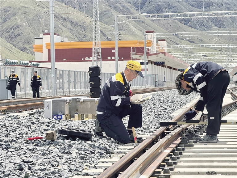 7月29日14时30分,拉林铁路山南站,马琳一手持道尺、一手握打号笔,一步一弯腰仔细检查线路,额头上沁满的汗珠在高原阳光下熠熠生辉。这位已在青藏铁路线上扎根29年的老线路工,用指腹反复摩挲着滚烫的钢轨边缘——这是他与铁路对话的特殊方式。