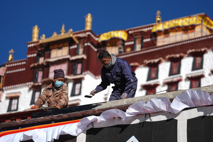 布达拉宫管理处维修科工作人员在粉刷墙体(2024年12月4日摄)。新华社记者 晋美多吉 摄