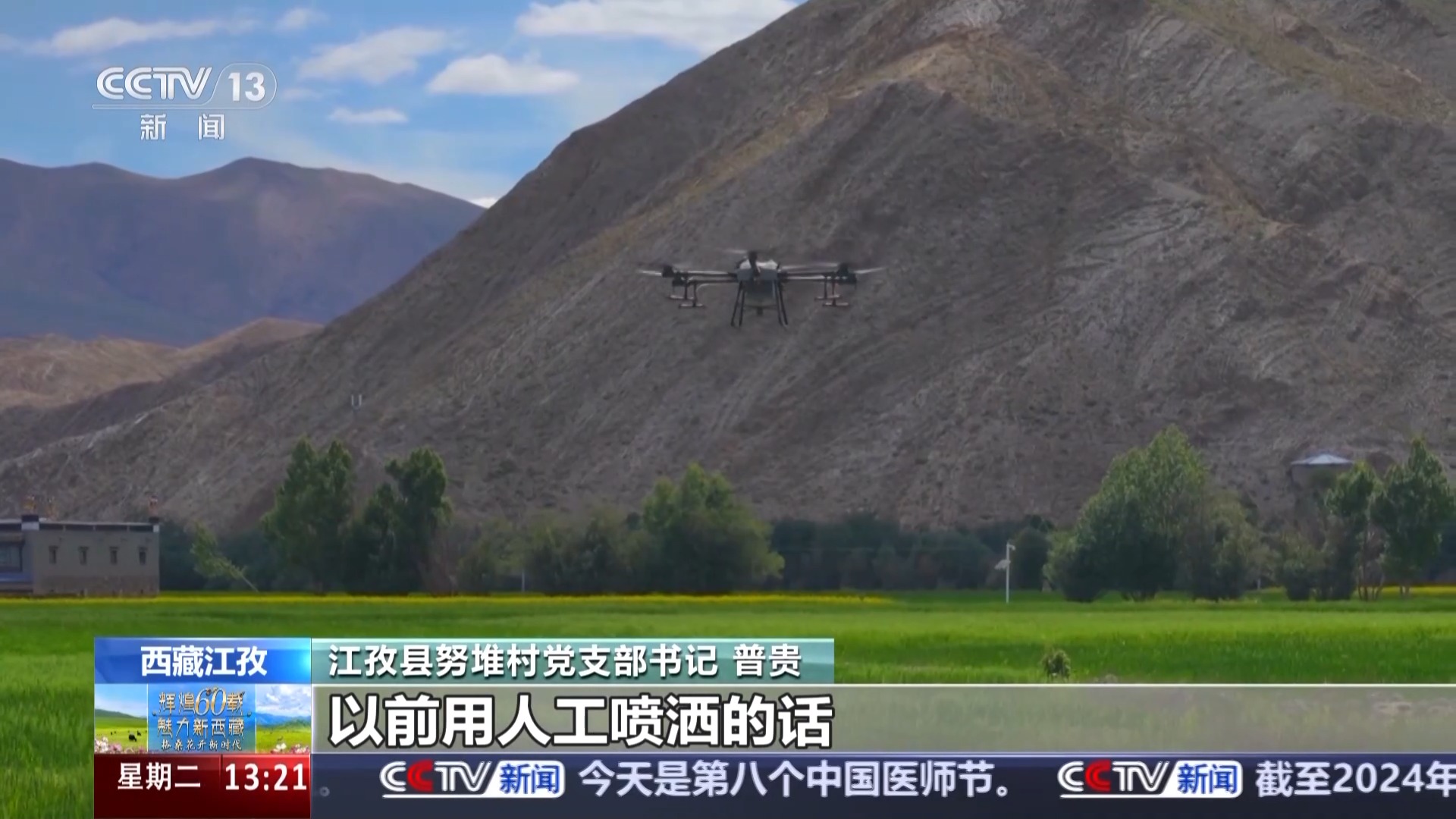 西藏日喀则市江孜县努堆村党支部书记 普贵:这几天我们正在给青稞喷洒叶面肥,以前人工喷洒,一亩地需要半小时左右。现在用无人机,半小时能喷洒30多亩地,我们村的2500多亩地大概需要两天就能完成。
