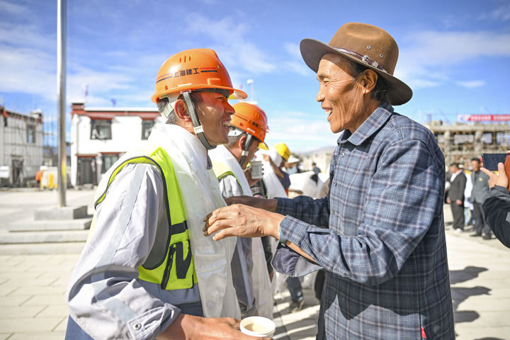 机器的轰鸣声与悠扬的藏民族歌曲交织在一起,村民们依次向援建者献上洁白的哈达、斟满飘香的酥油茶,还有村民用大拇指蘸着白色的糌粑在他们身上点个指印,宛如一个个真诚的“点赞”,场景温暖感人。