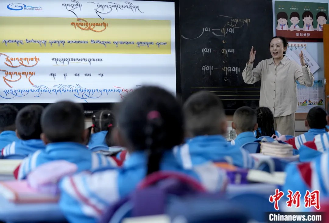 2025年3月10日,拉萨市第一小学藏语文老师桑旦旺姆使用科技设备在课堂上讲授藏语。中新社记者 李林 摄