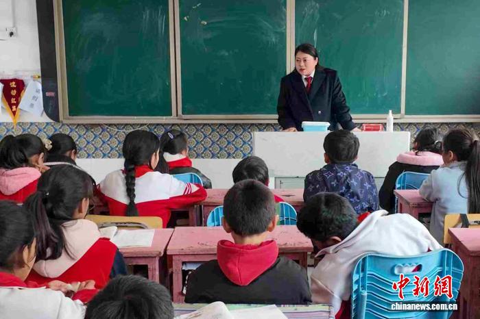 图为2025年4月,全国政协委员、西藏墨脱县人民法院综合审判庭庭长白玛玉珍在墨脱县格当乡小学为孩子们上法治课。(受访者供图)